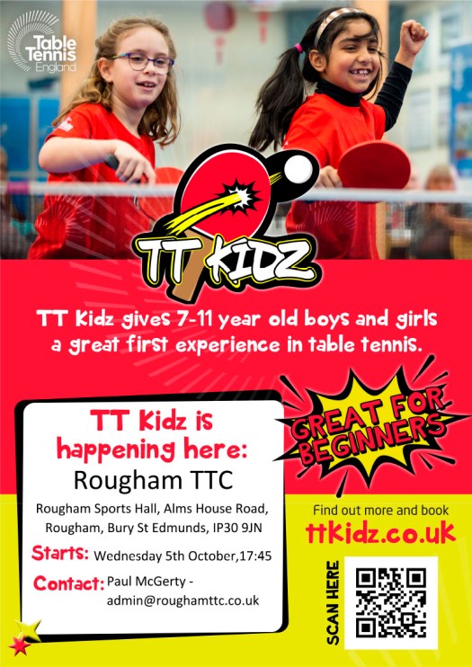From Wednesday 5th October (5.45pm to 6.45pm) Rougham Table Tennis Club will again be offering its fun TT Kidz 8 week programme. Aimed at 7 to 11 year old girls and boys it provides a great first experience of Table Tennis .